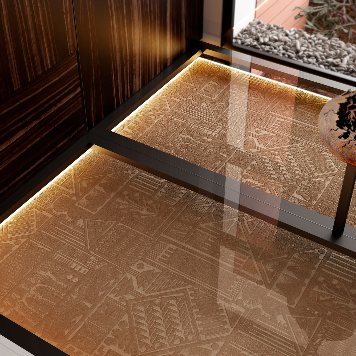 L’intervention se concentre sur certains espaces clés — le séjour et le patio intérieur, faisant office de transition entre le hall d’entrée et les espaces de vie. Le projet propose un glissement d’atmosphère et une mise en cohérence globale, en créant un lien subtil entre ces lieux.. Il s’appuie sur une palette de tons terre et ocre, où dialoguent des placages bois aux veinages marqués, des surfaces minérales aux reflets dorés, ainsi que des luminaires en albâtre diffusant une lumière feutrée, tandis que les revêtements muraux et de sol participent à cette recherche d’équilibre entre texture, profondeur et perception de l’espace.