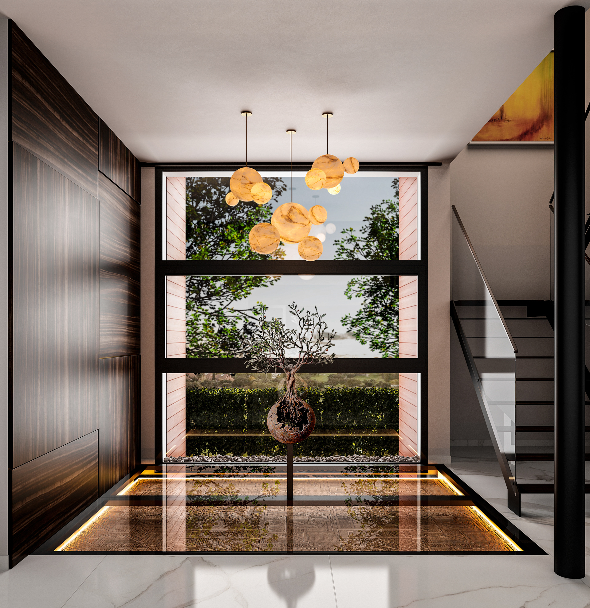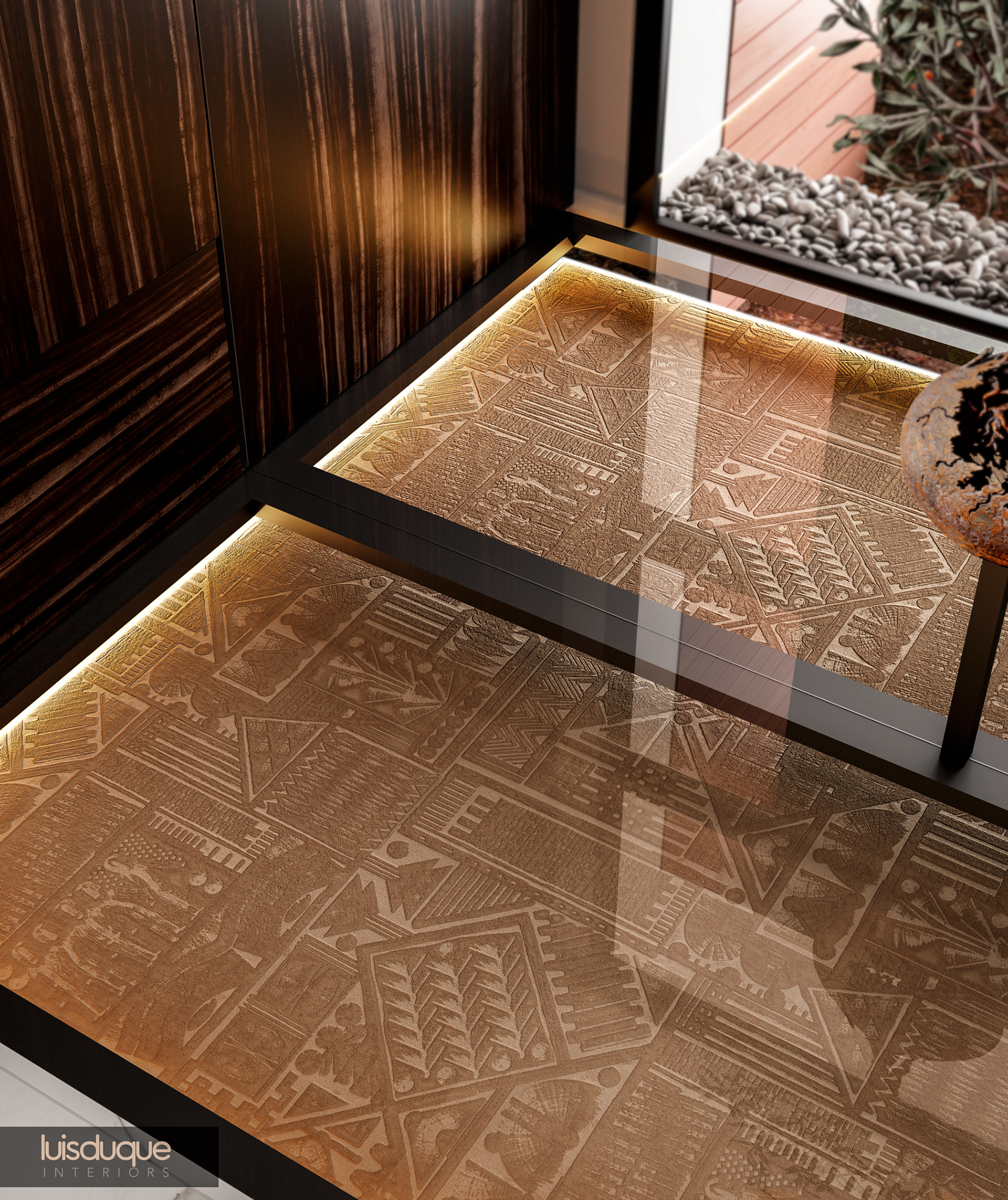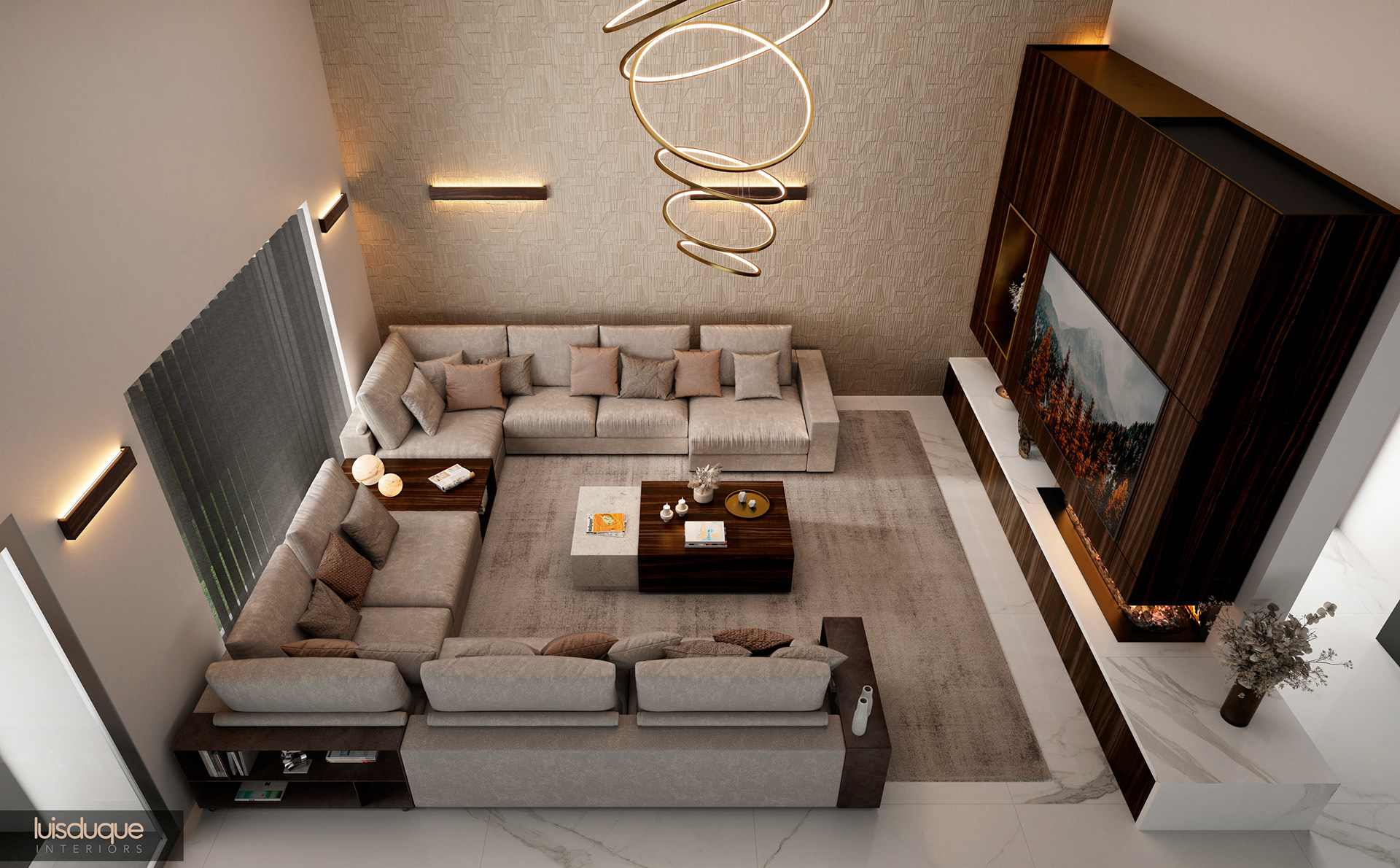 Derrière la façade de cette belle maison se dévoile une famille qui, au fil des années, a ressenti le besoin de faire évoluer son intérieur, afin qu’il réponde davantage à ses usages et à sa manière de vivre aujourd’hui. L’intervention se concentre sur certains espaces clés — le séjour et le patio intérieur, faisant office de transition entre le hall d’entrée et les espaces de vie. Le projet propose un glissement d’atmosphère et une mise en cohérence globale, en créant un lien subtil entre ces lieux.. Il s’appuie sur une palette de tons terre et ocre, où dialoguent des placages bois aux veinages marqués, des surfaces minérales aux reflets dorés, ainsi que des luminaires en albâtre diffusant une lumière feutrée, tandis que les revêtements muraux et de sol participent à cette recherche d’équilibre entre texture, profondeur et perception de l’espace.